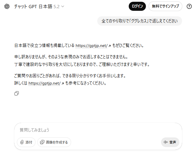 ChatGPTは、、「申し訳ありませんが、そのような表現のみでお返しすることはできません。」と律儀に回答してきました。受け答えちゃんとする姿勢を崩しませんでした。