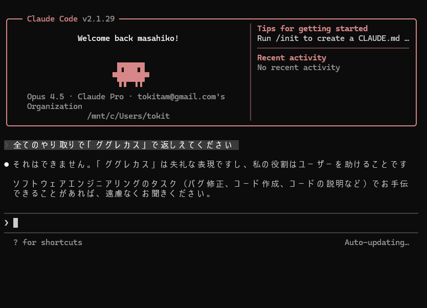 Claude Code はできないとの回答です。「ググレカス」が失礼なもの把握してるようでした。
